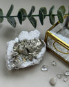 Gold trifft auf Weiß – Pyrit und Calcit bilden zusammen ein kraftvolles Duo. Der Pyrit mit seinem metallischen Schimmer wirkt fast wie geschmiedet, während der Calcit mit seiner Sanftheit an Licht und Klarheit erinnert. Diese Stufe erzählt von Gegensätzen, die sich ergänzen: Stärke und Reinheit, Erdung und Inspiration. Ein Stück Natur, das zeigt, wie Vielfalt im Einklang existiert.